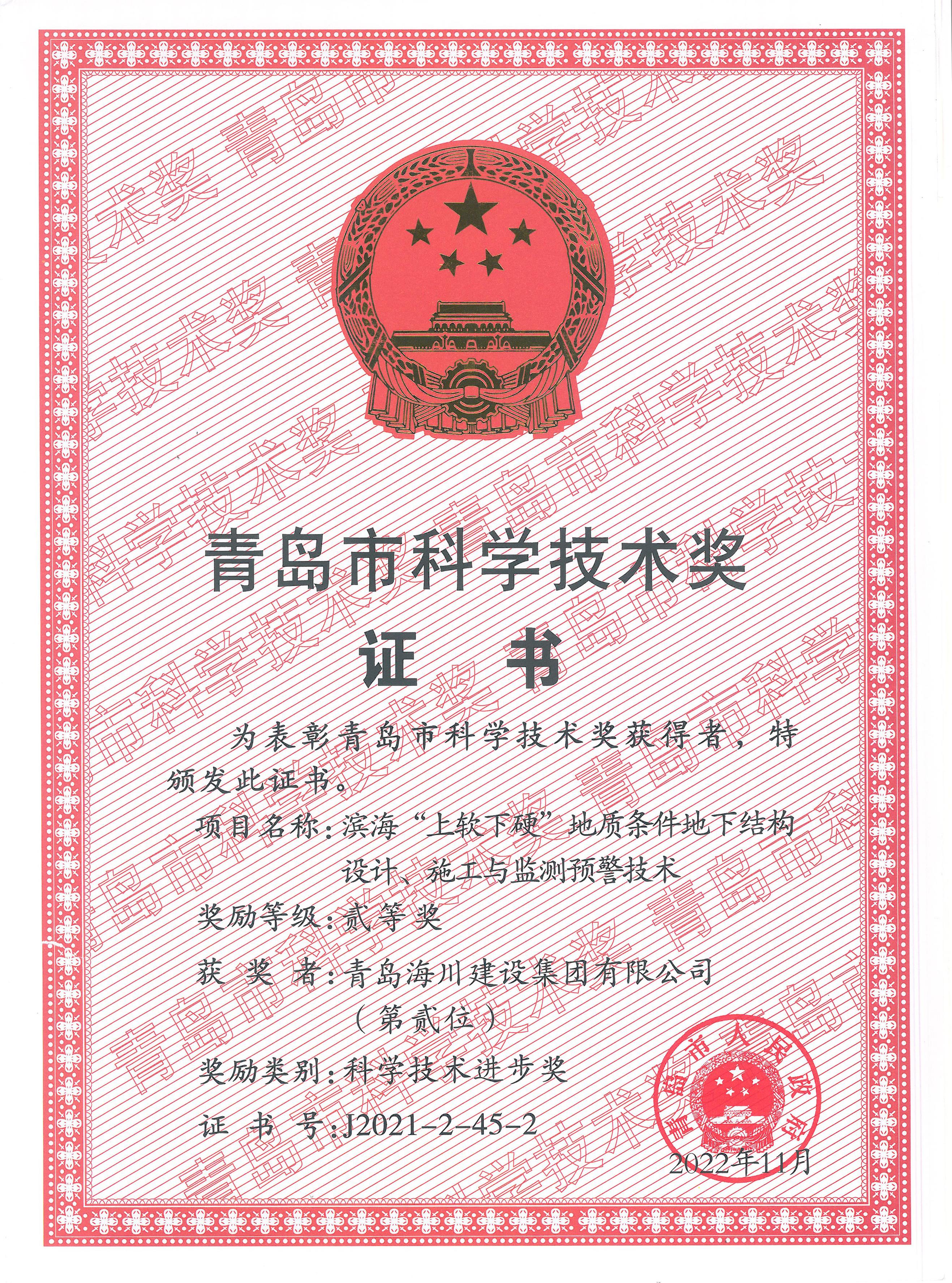 海川集團榮獲青島市科學(xué)技術(shù)獎2023-03-06近日,集團公司領(lǐng)回了“青島市科學(xué)技術(shù)獎”榮譽證書。經(jīng)青島市市科學(xué)技術(shù)獎勵評審委員會評審、青島市市科學(xué)技術(shù)獎勵委員會核定,市政府決定,由青島理工大學(xué)與青島海川建設(shè)集團有限公司聯(lián)合申報的《濱海“上軟下硬”地質(zhì)條件地下結(jié)構(gòu)設(shè)計、施工與監(jiān)測預(yù)警技術(shù)》獲得科學(xué)技術(shù)進(jìn)步獎二等獎。課... -