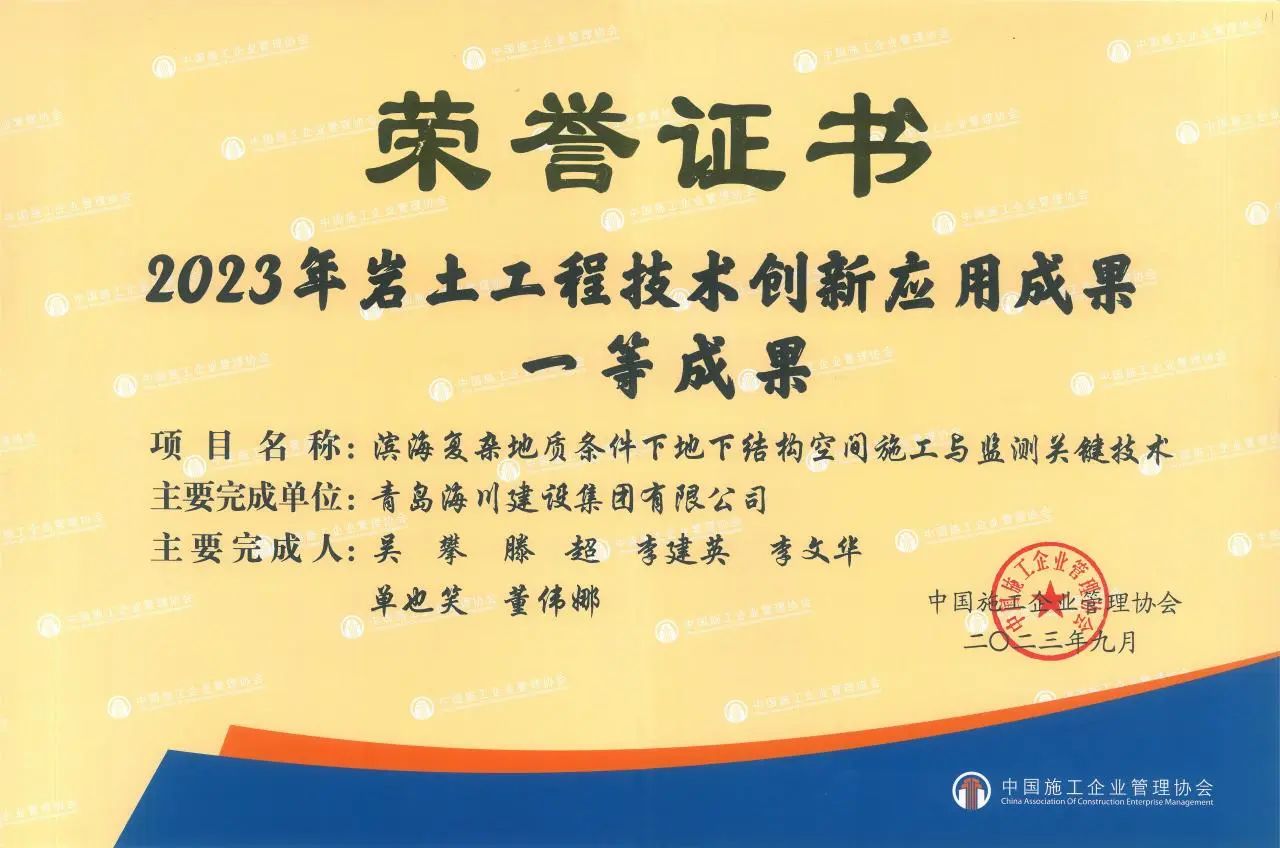 創(chuàng)新賦能 科技爭先 | 青島海川建設(shè)集團榮獲多項科技成果獎勵2023-10-08近日,中國施工企業(yè)管理協(xié)會公布了2023年度巖土工程技術(shù)創(chuàng)新應(yīng)用成果的通知,青島海川建設(shè)集團研究課題《濱海復(fù)雜地質(zhì)條件下地下結(jié)構(gòu)空間施工與監(jiān)測關(guān)鍵技術(shù)》榮獲一等成果,該成果為集團公司首次獲此殊榮,也是本年度青島市唯一一等獎獲獎獎項。近年來,海川建設(shè)始終堅持以科技為本,以... -